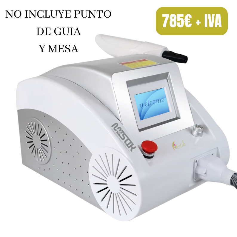 El láser emite pulsos de luz concentrada (532 nm, 1064 nm) según el color del tatuaje.